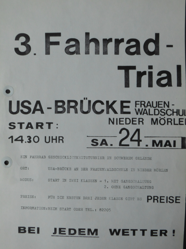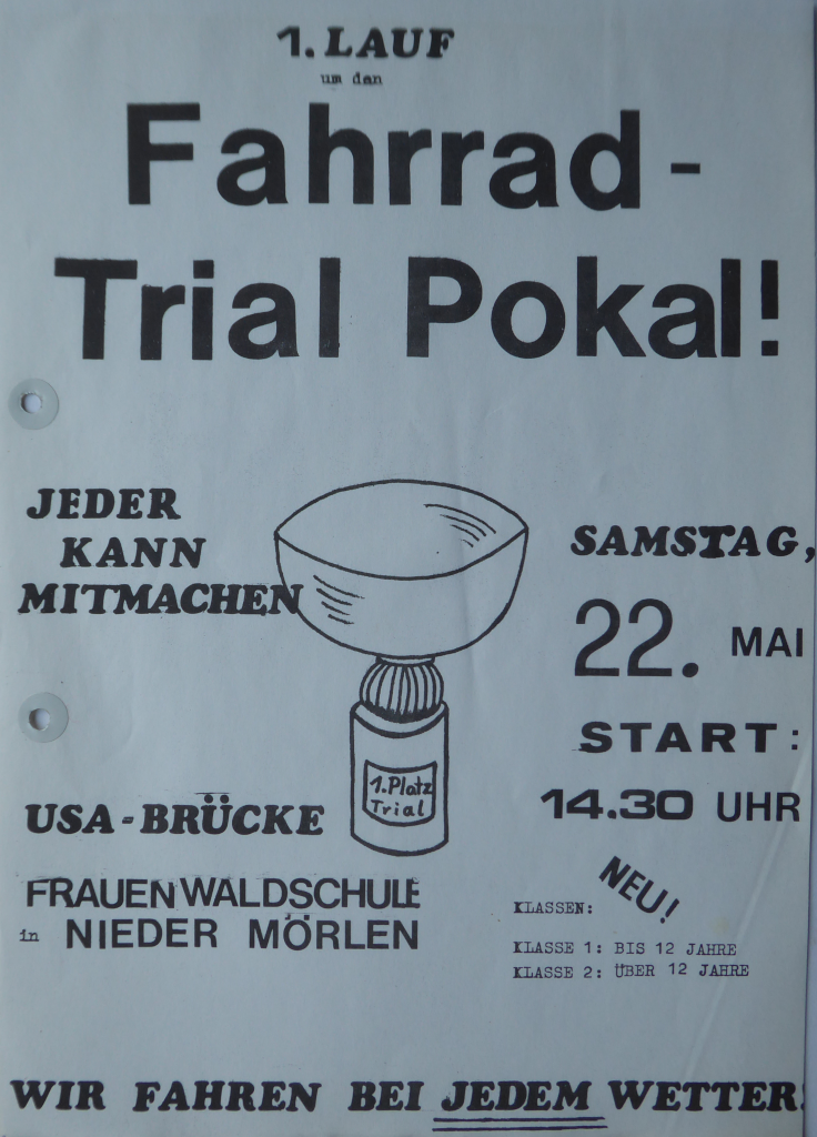 Diese Veranstaltung war eines von acht Fahrrad-Trials (siehe die Liste auf der Seite „Bad Nauheim – Fahrrad-Trial am 25.05.1974“) , die auf dem Gelände nahe der Frauenwaldschule in Nieder Mörlen im Frauenwald stattfanden. Es war kein besonderes, aber doch ein sehr brauchbares Waldgelände mit einer schönen Atmosphäre, das vielseitige Variationsmöglichkeiten bot und zudem ortsnah war. Der auf den Plakaten angegebene Ort war immer die Usabrücke an der Frauenwaldschule, von der aus die wenigen hundert Meter bis zum Start am Waldrand ausgeschildert waren.