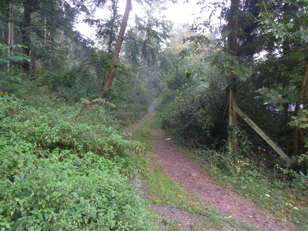 Ich füge noch ein letztes Foto bei, weil es unglaublich ist, wie sehr heute alles zugewachsen ist! Das nachfolgende Bild zeigt dieselbe Stelle, an der 1975 die Siegerehrung stattfand, nur etwas weiter nach links in den Weg geschwenkt, im Jahr 2014! Die Leute bei der Siegerehrung würden auf dem untenstehenden Bild am rechten Bildrand hinter der schrägen Zaunstrebe stehen. Bei beiden Fotos befand sich der Fotograf am Waldrand auf der Waldstraße. Der Weg führt übrigens zum Äppelwoitreppchen.