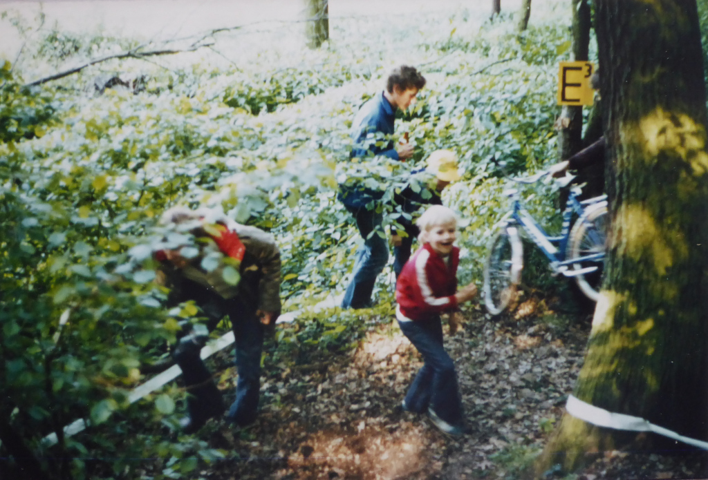 Der erste Lauf zu diesem Pokal fand am 22. Mai 1976 auf dem Gelände nahe der Frauenwaldschule in Nieder Mörlen statt. Diesmal wählte ich dort einen relativ weitläufigen Rundkurs, der zunächst steil bergauf führte, so daß die Teilnehmer auf diesem Stück der Zwischenstrecke schieben mußten. Unterwegs gab es dort die ersten Sektionen. Nach einem Querstück fast ganz oben auf einem Hangweg – ganz oben auf dieser Seite kann man sich auf dem zweiten Foto eine Vorstellung von dem Waldhang machen – ging es dann querfeldein den steilen Waldhang wieder hinunter, aber schräg, damit es nicht zu steil war. Nach meinen Beobachtungen beim 3. Fahrrad-Trial (in Sektion 3, siehe oben!) hatte ich Angst vor eventuell durchgehenden Fahrrädern und wollte nichts riskieren.