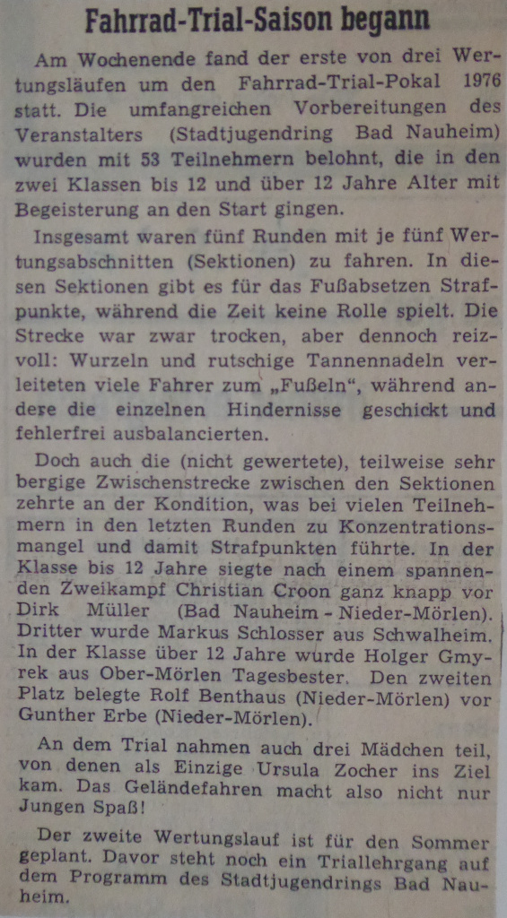 Ich hänge hier einige damalige Zeitungsausschnitte über diesen zweiten Wertungslauf um den Fahrrad-Trial Pokal 1976 an, der das 6. Fahrrad-Trial des Stadtjugendrings Bad Nauheim war. Zunächst den Bericht in der regionalen WETTERAUER ZEITUNG und dann meine Berichte im FAHRERLAGER und im damals neuen, 1976 von Felix Krahnstöver ins Leben gerufenen TRIALSPORT..