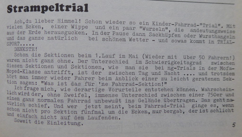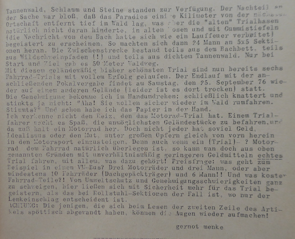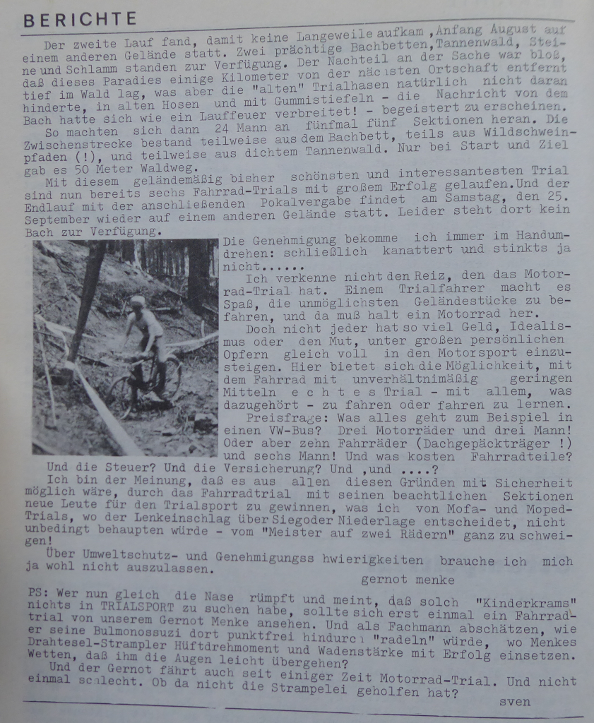 Vor allem aber: obwohl die Teilnehmer damals wenig Ahnung vom Trialfahren hatten, standen sie im Mittelpunkt der Veranstaltung! Das war der Knackpunkt. – Mißerfolge taten nicht weh, weil es allen so erging. Und da man gemeinsam damit beschäftigt war, eine für das gegebene Niveau hohe fahrerische Hürde zu überwinden, kamen ein starkes Gemeinsamkeitsgefühl, Tatendrang und jede Menge Spaß zusammen. Eine solche zwanglose und heitere Atmosphäre wie bei diesem Trial habe ich sonst nur ein einziges Mal erlebt. 1