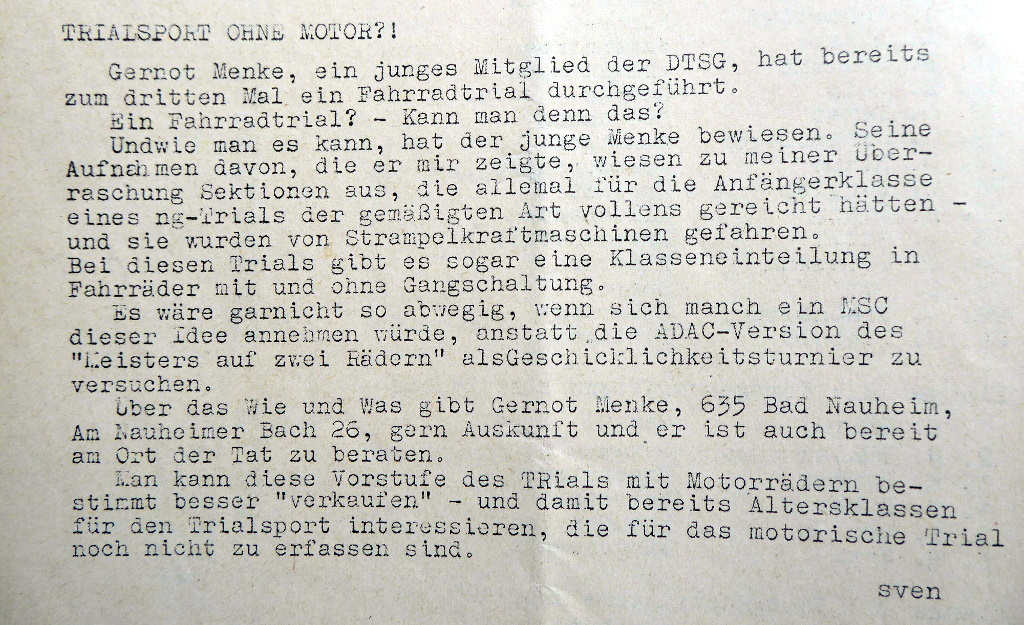 Pere Pi gab nun dem Fahrrad-Trial den Namen „Trialsin“ – „Trial ohne“: „Der Name Bici-Trial wurde durch Trialsin ersetzt, da es sich um ein Trial ohne Abgase, ohne Motor und ohne Lärm handelte … Das geschah 1979“. 2 Pere Pi übernahm damit exakt den Titel des Artikels „Trialsport ohne Motor“, den ich ihm ein paar Monate zuvor geschickt hatte. Der Artikel und die Überschrift stammten von Sven Kuuse (1923-2003), dem Redakteur des FAHRERLAGER. Der Fürstenhagener Werbefilm für das Fahrrad-Trial, den Felix Krahnstöver bei seinem zweiten Besuch bei Pere Pi im Sommer 1979 mitgebracht hatte, wurde in derselben Weise eins zu eins abgekupfert und ein praktisch identischer Montesita-Werbefilm gedreht – übrigens in fast noch grottenschlechterer Qualität, als der Fürstenhagener Film. 3 Und auch das dritte Element, das Datum 1974 des ältesten damals bekannten Fahrrad-Trials in Bad Nauheim, wurde von Pere Pi „kopiert“ und zog sich fortan wie eine magische Zahl durch seine historischen Darstellungen des Fahrrad-Trials – sei es, daß er (anfangs) versuchte, mit wechselnden (!) Geschichten dieses Datum zu „erreichen“, sei es, daß er (später) dieses Datum konsequent verschwieg.